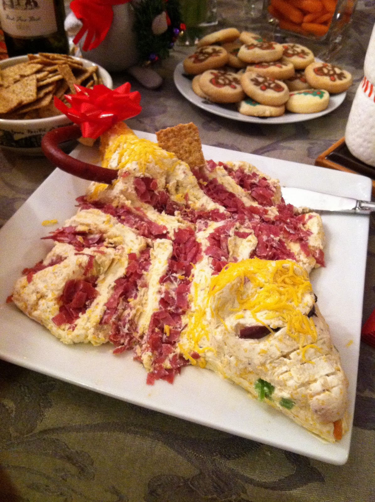 Pigs in a blanket in the shape of a wreath w/a fruit roll up bow, Sausage Balls, Chicken Biscuits, Hot Wings, Tater tots wrapped in bacon, Redneck Sushi, PB&J Sushi, Mac n' Cheese Tarts, Jalapeno Cheese Bread, Queso/chips, Roadkill cheeseball, Veggies, Fruit, Cookies galore, Mississippi Mud Brownies, Espresso Brownies, Mexican Wedding Cookies and a Moon Pie Christmas Tree!